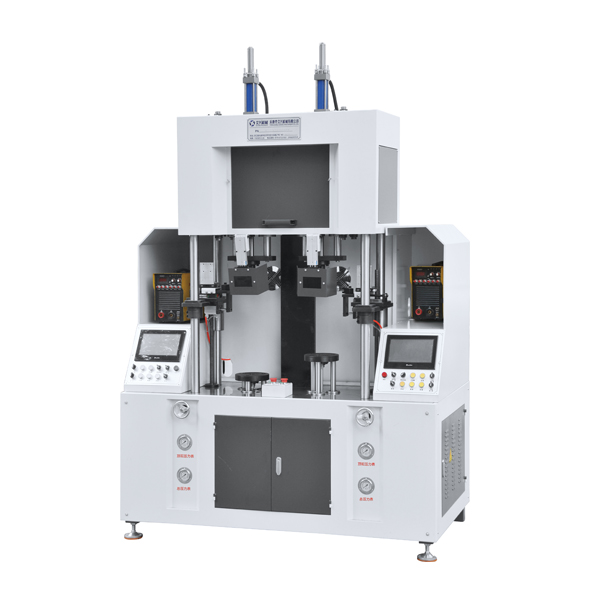 双工位内撑直口自动焊机)主要用于杯壶内胆、外壳直口压配后的焊接工艺。机架部份采用板金和5#方管整体焊接。焊枪位置角度调节方便。护目镜自动保护人脸。焊枪结构跟杯口灵活性好,操作简单易学,效率高,稳定性好,将产品放入设备模具中,按下启动,上缸顶头模具配口、气动卡盘夹紧产品主轴旋转、手轮微调焊枪位置,点火焊接一周,即可完成。加工产品稳定。是金属器皿制造加工企业的理想设备。